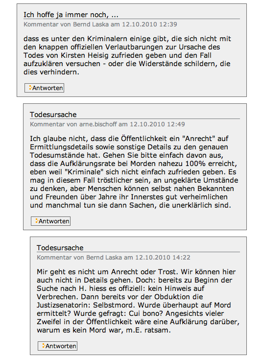 Donnerstag, 1. Juli 2010, ca. 9:00 h (erster Kommentar 9:25 h)![]() Eilmeldung: Richterin Kirsten Heisig vermisst (*) UPDATE 13 Uhr: Nach Informationen aus "Ermittlerkreisen" sind Anhaltspunkte vorhanden, die leider auf einen Suizid schließen lassen. Diese Meinung vertrat die Redaktion von da an, ganz in Einklang mit den "politisch korrekten" Leitmedien, ohne jede nähere Begründung - was sich so auswirkte, dass Kommentare, die die Suizidthese anzweifelten, oftmals umgehend gelöscht wurden. In einem redaktionellen Kurzhinweis vom 29. Juli auf das gerade erschienene Buch von Heisig heißt es: "Das von der Berliner Jugendrichterin Kirsten Heisig geschriebene Buch Das Ende der Geduld erscheint nach ihrem Selbstmord, der übrigens weder von ihrer Familie noch von Freunden angezweifelt wird, wie ein Vermächtnis..." Daraufhin kommentierte Leser/in Marti (Nr. 39, 29.7., 10:42 h): Die barsche Antwort: