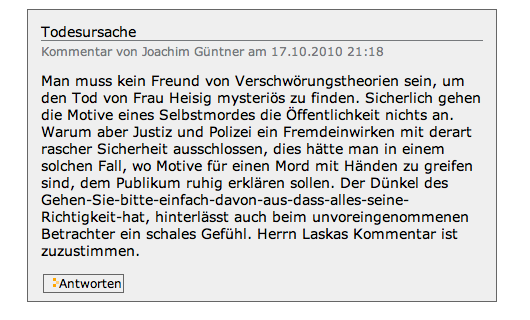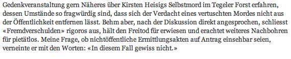 Wenn auch gelegentlich zaghaft Zweifel an der amtlichen Version, wie Heisig zu Tode gekommen ist, aufscheinen, so bleibt es meist dabei, ohne auf die Konsequenzen einer solchen Sicht einzugehen (s.o. 14. Nov. 2014). |