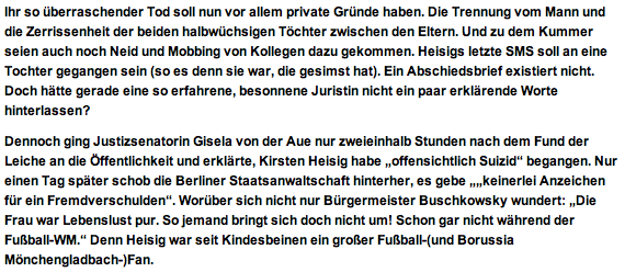 16. Nov. 2010, Der Tagesspiegel (Berlin) Verschwörungstheorien um den Tod von Kirsten Heisig Einzig die Justizsenatorin wirkte unprofessionell. "Schlampigkeit kann man den Behörden wohl nicht vorwerfen. So wurde die Mordkommission an den Fundort gerufen. ... Sogar der Leiter der Berliner Rechtsmedizin, Michael Tsokos, wurde nach Heiligensee gerufen. ... Nur eine wirkte für Beobachter unprofessionell: Ausgerechnet Heisigs Chefin, Justizsenatorin Gisela von der Aue (SPD) wartete nicht das Ergebnis der Obduktion ab, sondern verkündete wenige Stunden nach dem Fund der Leiche ihr 'vorläufiges Ergebnis: Suizid' - für Verschwörungstheoretiker ein Indiz mehr." |