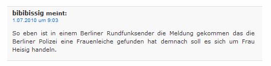 Am 1. Juli erschienen die ersten Berichte über die vermisste Jugendrichterin Kirsten Heisig in örtlichen und überregionalen Zeitungen, von nun an täglich, in den Online-Portalen auch mehrmals täglich. Kennzeichnend für alle Berichte in den Medien ist, dass die nächstliegende Vermutung, Heisig sei entführt oder gar ermordet worden, auch nicht andeutungsweise erwähnt wurde. Dies war in der Folge unisono in den Leitmedien und deren publizistischem Tross zu lesen. Man gab sich - aufgrund der Verhängung einer totalen Nachrichtensperre die politische Brisanz des Falles gewiss bemerkend - mit dieser Version zufrieden. Beispiel: Der Tagesspiegel (Berlin): Am Sonnabend, den 3. Juli, wurde also Heisigs Leiche am frühen Nachmittag, gegen 15:45 h, gefunden, wenige hundert Meter von dem Ort entfernt, an dem ihr Wagen geparkt war. An diesem Tag, von 16:00 bis 17:45 h, fand eines der spannendsten Spiele der Fussballweltmeisterschaft statt: Deutschland gegen Argentinien im Viertelfinale. Deutschland gewann sensationell 4:0. Trotz des allgemeinen Siegestaumels berief die Berliner Justizsenatorin Gisela von der Aue, die schon in den Vortagen nachdrücklich die These "kein Verbrechen" verkündet hatte, um 18:00 h zur Pressekonferenz in die Justizverwaltung. Sie wolle Kirsten Heisig würdigen und "den Spekulationen ein Ende bereiten." Um welcherart Spekulationen es sich handelte, sagte sie nicht. Stattdessen verkündete die Senatorin, "die zeitweilig nur schwer ihre Tränen zurückhalten konnte", folgendes: "Nach bisherigen Erkenntnissen müsse man wohl von einem Suizid ausgehen." Staatsanwaltschaft und Polizei freilich wollten noch das rechtsmedizinische Gutachten abwarten. Dies liess nicht lange auf sich warten: schon am nächsten Tag, am Sonntag, den 4. Juli, stand offiziell fest: Es war Suizid. (vgl. Tagesspiegel, 4. Juli: Von unnachgiebiger Freundlichkeit) Die übergrosse Eile, mit der die Justizsenatorin inmitten der Fussball-WM-Siegesfeiern zur Pressekonferenz lud, um die schon zuvor in den Medien ventilierte Suizidthese zu bekräftigen, war auffällig, wurde aber in den Zeitungsberichten meist übergangen. Ausnahmen waren Emma, 7. Juli ("befremdlich") und Tagesspiegel, 16. Nov. ("unprofessionell") -- ohne freilich den Verdacht zu äußern, dass die Senatorin als Adressat nicht die Berliner Bevölkerung im Sinn hatte, die den soeben errungenen Fussball-Sieg feierte, auch nicht die erschienenen Journalisten, sondern primär den ebenso eilig zum Fundort der Leiche bestellten Chef der Berliner Rechtsmedizin, Michael Tsokos (vgl. 23. Sept. 2010, Berliner Zeitung / 5. Nov. 2010, Talkshow "Riverboat"). Tsokos nahm noch am Abend des gleichen Tages die Obduktion vor, so dass am Sonntag, den 4. Juli, die Suizidthese offiziell bestätigt werden konnte. Vgl. hierzu auch: * * * * * * * * * * * * * * * * In einigen Medien wurde am 1. Juli berichtet, dass Suchtrupps der Polizei eine Frauenleiche gefunden haben.
