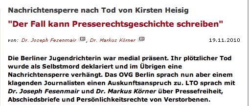 19. Nov. 2010, Legal Tribune Online "Der Fall kann Presserechtsgeschichte schreiben" ![]() ![]() Wie die Formulierung, Heisigs "plötzlicher Tod wurde als Selbstmord deklariert" zeigt, geht die Redaktion der LTO, jedenfalls deren hier gesprächsführende Leiterin Pia Lorenz, nicht davon aus, dass die von den Behörden verlautbarte Version, bei Heisigs Tod sei - durch Mordkommission und Obduktion bestätigt - "keine Fremdeinwirkung festgestellt worden", unhinterfragbar ist. Sie kommt deshalb im Verlauf des teilweise recht interessanten Interviews auch wieder auf diesen Kernpunkt zurück, dass "die Presse nicht recherchieren kann, ob eine Selbsttötung vorlag, weil die Behörden ihr Informationen vorenthalten, weil angeblich eine Selbsttötung vorlag." Da beiße sich die Katze in den Schwanz, denn "die eigentlichen Ermittlungen sollen ja von der Staatsanwaltschaft getätigt werden" -- die die komplette Nachrichtensperre verhängt hat. In diesem Fall ist die komplette Nachrichtensperre schwer verständlich. Der "an sich" auffälligste Punkt an der ganzen Affaire, nämlich, dass die gesamte Presse die komplette Nachrichtensperre stillschweigend akzeptiert hat und nur ein einziger "freier" Journalist dagegen vorging, blieb in diesem sich auf das Juristische beschränkenden Gespräch unerwähnt. Das Interview fand vor Bekanntwerden des Inhalts des Berichts der Generalstaatsanwaltschaft statt. Danach wurde der Fall Heisig in der LTO nicht mehr thematisiert. |